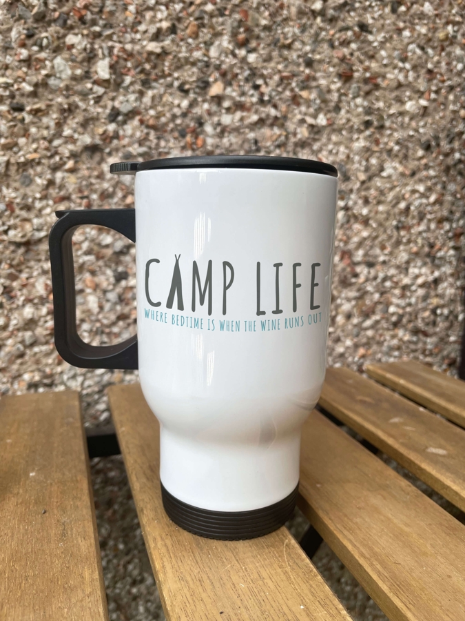 | Design | Camp Life, Fire Pit & Chill, Dogs Welcome, Bra, Water or Gin, My Kid's Attitude, Eat, Swear at Tent Poles, I'm Outdoorsy, Crackling Fire, Team Becki, Team Johnny |